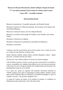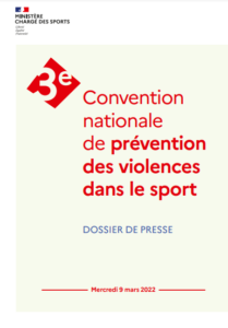 La 3ème Convention nationale de prévention des violences dans le Sport s’est tenue le mercredi 9 mars 2022 à l’Assemblée nationale en présence de Richard FERRAND, président de l’Assemblée Nationale, Jean-Michel BLANQUER, ministre de l’Education nationale, de la Jeunesse et des Sports, Roxana MARACINEANU, ministre déléguée chargée des Sports, Eric DUPOND-MORETTI, garde des Sceaux, ministre de la Justice et Adrien TAQUET, secrétaire d’État en charge de l’enfance et des familles et Brigitte HENRIQUES, présidente du Comité National Olympique et Sportif Français.