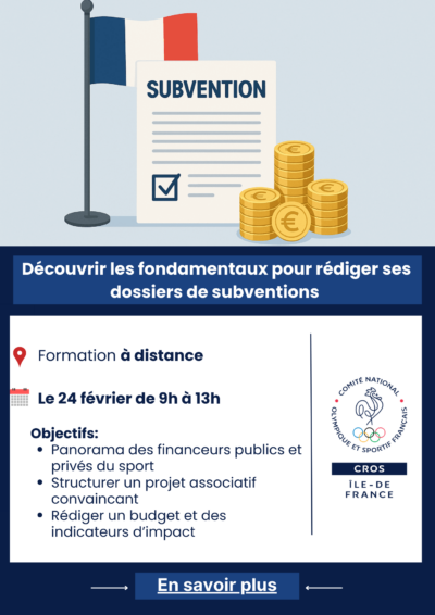 Zeina HELOU2026-02-11T12:26:20+01:0006/11/2025| Découvrir les fondamentaux pour rédiger ses dossiers de subventions Date: 24 février 2026 Heure: 9h – 13h Modalité: en VISIO via TEAMS Tarif: Licencié du mouvement sportif: 50€ – 100€ non adhérents