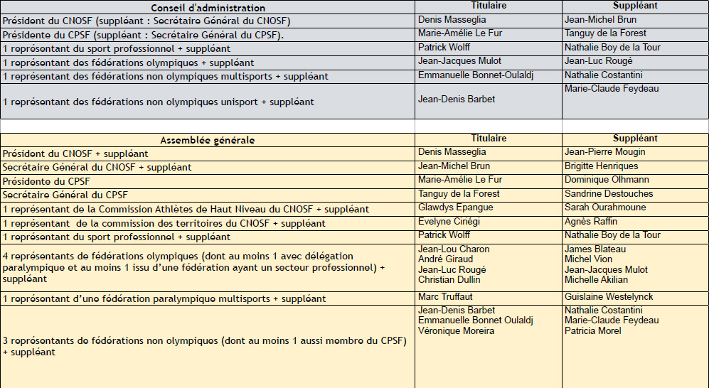 À cette fin, le mouvement sportif a désigné, le 19 mars, ceux qui y siégeront en son nom. Parmi eux et au titre de la commission des Territoires du CNOSF, Evelyne Ciriegi, Présidente du CROS Île-de-France. Le CNOSF a également choisi les six personnes qui feront partie du Conseil d’Administration de la nouvelle instance. En l’occurrence, les Présidents des Comités olympique et paralympique, Denis Masseglia et Marie-Amélie Le Fur ; Jean-Jacques Mulot et Jean-Denis Barbet, respectivement Présidents des Fédérations françaises d’aviron et de squash ; Patrick Wolf, Président de l’Association Nationale des Ligues de Sport Professionnel (ANLSP) ; et enfin, Emmanuelle Bonnet-Oulaldj, Coprésidente de la Fédération Sportive et Gymnique du Travail (FSGT).