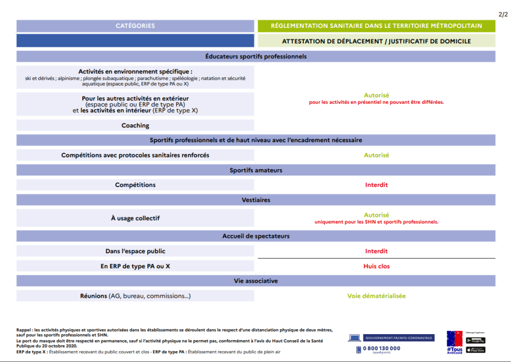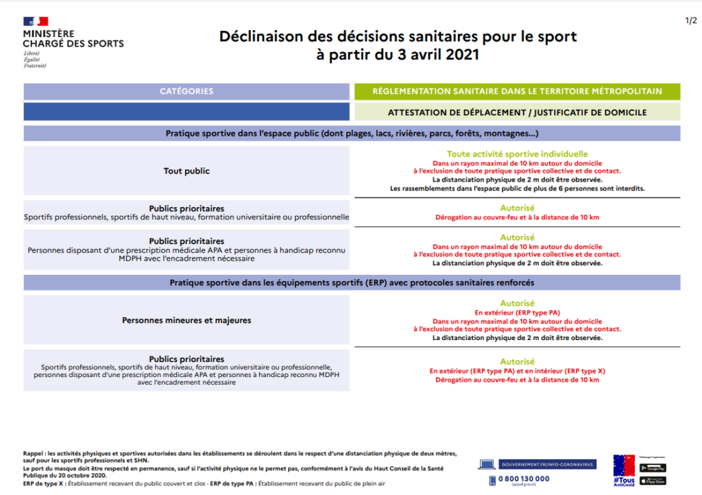 Considérant que l’activité physique et sportive est indispensable pour notre jeunesse et soucieux d’apporter des solutions aux familles pour prendre en charge les enfants en plein air, de manière organisée, encadrée et sécurisée dans cette période marquée par les vacances scolaires, le gouvernement a autorisé la pratique en extérieur uniquement et dans le respect de la distanciation, qu’elle se déroule dans l’espace public ou dans les équipements sportifs de plein air. Toutefois, le couvre-feu (dans toute la France) et la limitation à 10 km autour du domicile devront être respectés.