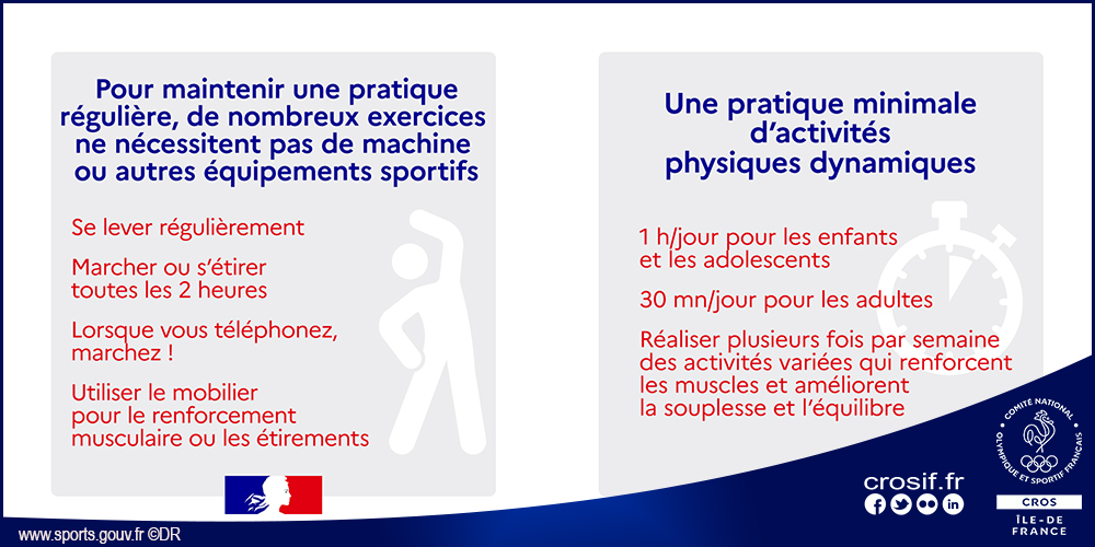 Pendant cette période de confinement, le ministère des Sports, avec le concours de l’Observatoire national de l’activité physique et de la sédentarité, vous accompagne pour maintenir une activité physique régulière à votre domicile avec des recommandations et des conseils simples à mettre en pratique, quel que soit votre âge, si votre condition physique et votre santé le permettent.