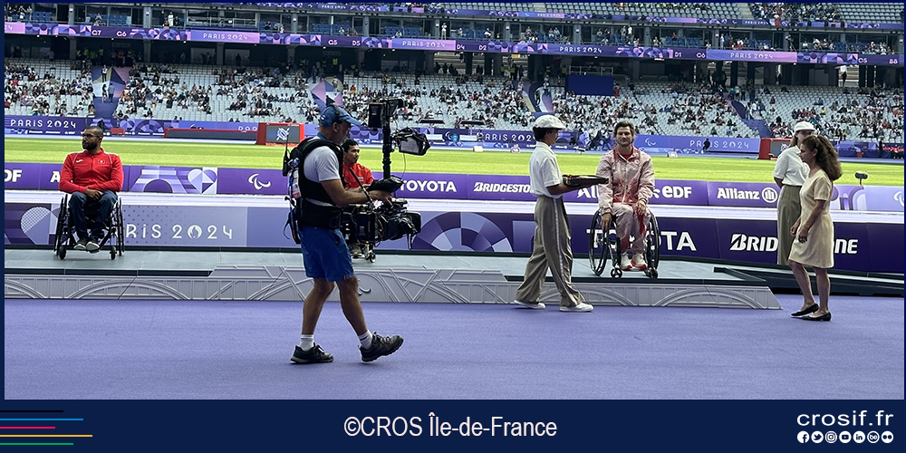 Ce lundi 2 septembre les Jeux Paralympiques de Paris 2024 étaient marqués par plusieurs épreuves se déroulant au Stade de France dont l’épreuve du 100m Hommes dans la catégorie T34. C’est à cette occasion que la Présidente du CROS Île-de-France Evelyne Ciriegi a pu participer à ce grand moment de la « cérémonie des vainqueurs ». En effet, c’est elle qui a eu l’honneur de remettre au thaïlandais Chaiwat Rattana sa médaille d’or, au tunisien Walid Kitla sa médaille d’argent et au canadien Austin Smeenk sa médaille de bronze.