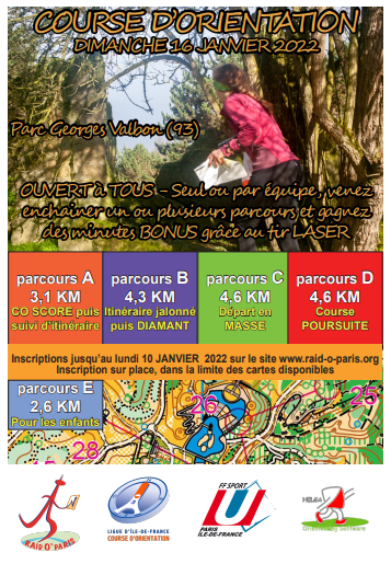 Le dimanche 16 janvier, participez à la course d’orientation au Parc Georges Valbon. Dans le respect de la plage horaire des départs (2h30), chaque participant est libre de réaliser dans l’ordre de son choix les parcours qu’il aura choisis. En plus de ses parcours, il pourra récupérer un BONUS en effectuant un tir à la carabine laser.