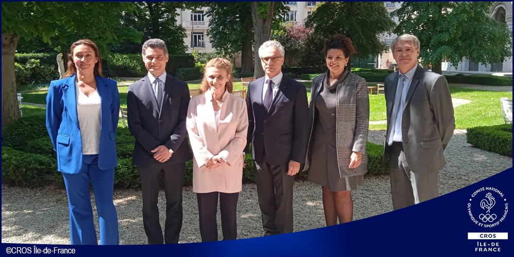A ses côtés, les Vice-Présidents Pierre Rabadan, Adjoint à la maire de Paris en charge du sport et Séverine Desbouys, représentante de la CPME, accompagnés du préfet de Région Marc Guillaume, de son représentant Pierre-Antoine Molina et du Directeur de l’Agence nationale du Sport Frédéric Sanaur.
