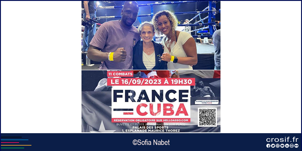 Sofia Nabet double championne de France de boxe, médaillée internationale et ambassadrice du CROS Île-de-France elle aussi était présente aux côtés de notre Présidente : « Cet évènement est top, soutenir l’équipe et de pouvoir accueillir une Nation comme Cuba, incroyable. C’est une belle organisation ici à Tremblay avec de beaux combats et un public venu nombreux »