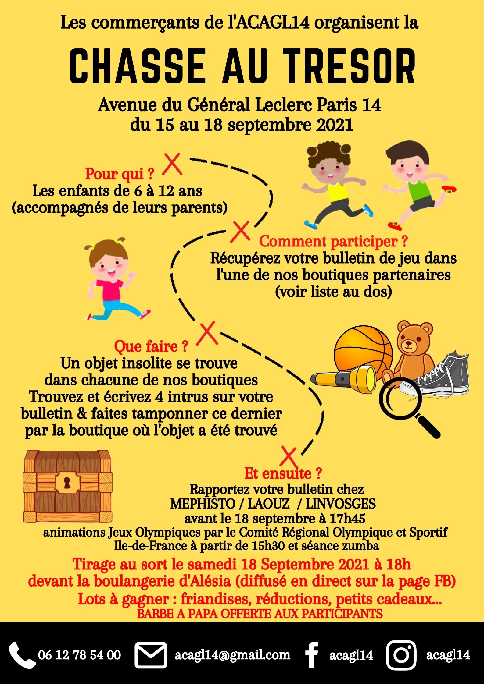 Les commerçants de l’ACAGL14 (Association des Commerçants de l’Avenue du Général Leclerc dans le 14ème arrondissement) organisent une chasse au trésor du 15 au 18 septembre 2021. Elle se déroulera Avenue du Général Leclerc à Paris (14).