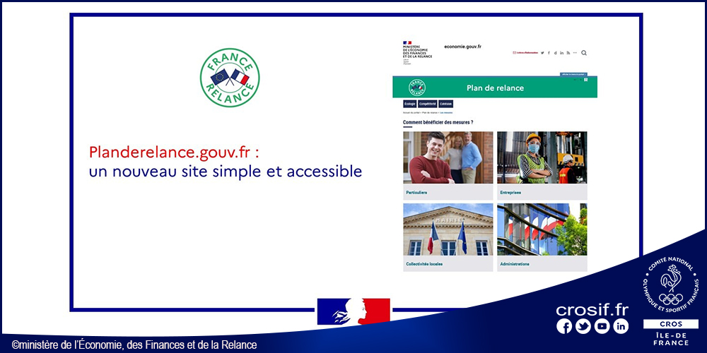 Le ministère de l’Économie des Finances et de la Relance, a lancé le jeudi 8 octobre planderelance.gouv.fr. Les particuliers, les entreprises, les collectivités ou bien encore les administrations peuvent retrouver sur cette plateforme l’ensemble des mesures dont ils peuvent bénéficier dans le cadre du Plan de relance, et notamment dans le secteur du sport.