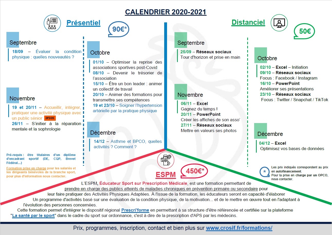 Le programme prend actuellement en compte uniquement le dernier trimestre 2020. Il va s’étoffer au fur et à mesure en fonction de vos retours, de vos besoins et de l’actualité. L’objectif étant de proposer en permanence des formations qui répondent aux attentes du mouvement sportif.