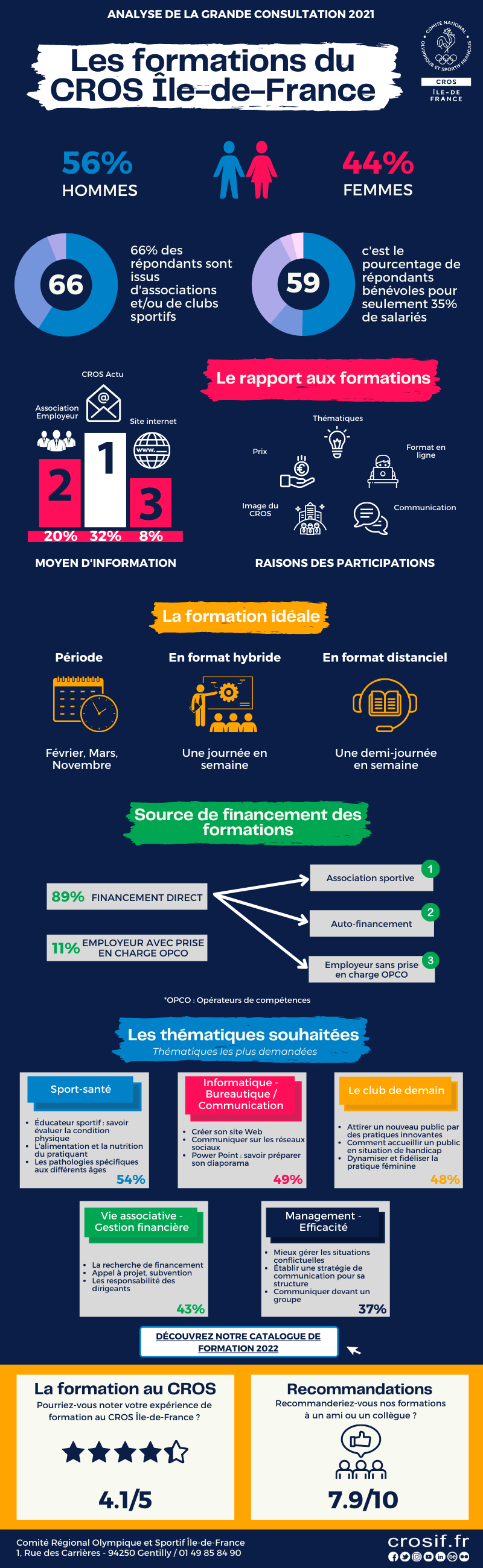 En cette fin d’année, le CROS Île-de-France a réalisé une grande consultation pour proposer une offre de formation au plus près des besoins des acteurs du sport francilien. À la suite de cette enquête, dont vous trouverez une infographie ci-dessous, le CROS Île-de-France a réalisé le catalogue des formations 2022 qui recense l’intégralité des formations de l’année. Vous pouvez d’ores et déjà vous inscrire aux premières formations de l’année.