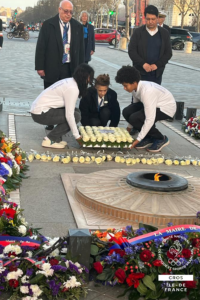 « Par une belle soirée de printemps ensoleillée, nous avons eu la chance de défiler sur les Champs-Élysées, de déposer des fleurs, puis la gerbe du CROS Île-de-France déposée par la Présidente Evelyne Ciriégi et enfin une gerbe déposée par Madame la Secrétaire d’Etat, sur la tombe du Soldat inconnu. Ensuite le glaive du ravivage tenu par Madame la Secrétaire d’Etat, entourée de 2 jeunes du Mouvement sportif, avant de signer le Livre d’or. Par ailleurs, le drapeau du CROS Île-de-France a été salué par les autorités. Le tout au son de la musique de la Police nationale », raconte Michel Jomin.