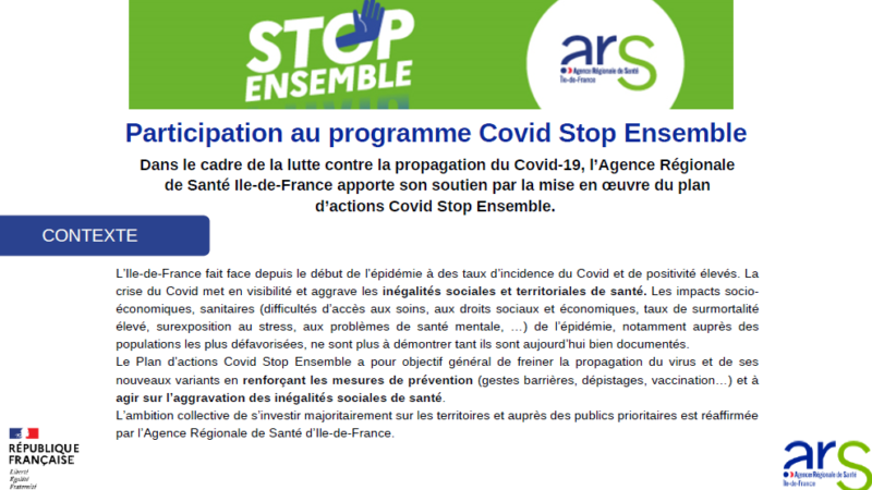Le Plan d’actions Covid Stop Ensemble a pour objectif général de freiner la propagation du virus et de ses nouveaux variants en renforçant les mesures de prévention (gestes barrières, dépistages, vaccination…) et à agir sur l’aggravation des inégalités sociales de santé. Le programme cherche à mobiliser l’ensemble de la population francilienne et à sensibiliser certains publics souvent plus exposés et plus fragiles, à l’intérêt des mesures de prévention (gestes barrières, dépistage, vaccins).
