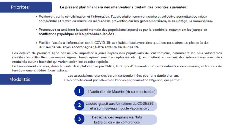 - Faciliter l’accès à l’information sur la COVID-19, aux habitants/citoyens des quartiers populaires, au plus près de leur lieu de vie, et les accompagner à être acteurs de leur santé. Le financement couvrira, dans la limite d’un plafond fixé par l’ARS, le temps d’intervention et de coordination des salariés, et les frais de fonctionnement dédiés à ces actions.
