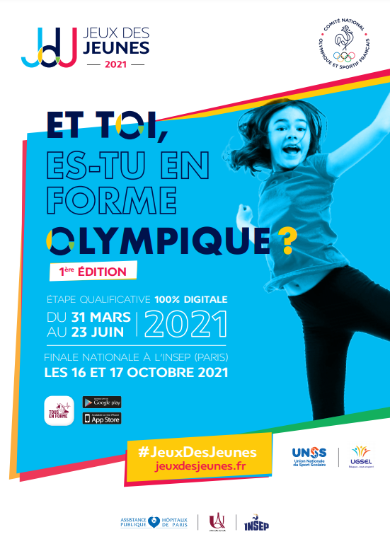 - Une étape locale, 100% digitale, au sein des établissements scolaires, du 31 mars au 23 juin 2021 : compte tenu du contexte sanitaire, les épreuves de cette étape qualificative pour la finale nationale seront réalisées grâce à TOUS EN FORME, une application créée par l’Université de Paris et l’Assistance Publique des Hôpitaux de Paris (APHP) disponible gratuitement. L’étape locale ne nécessitera aucun rassemblement inter-collège et s’articulera autour de 2 piliers :