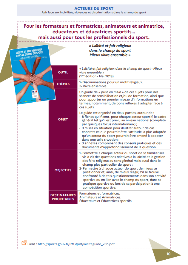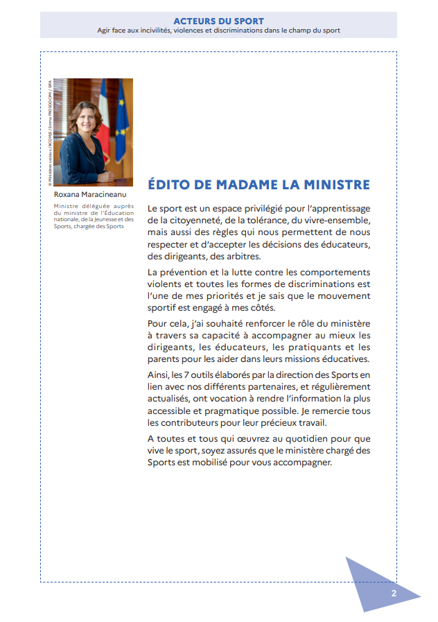 « Le sport est un espace privilégié pour l’apprentissage de la citoyenneté, de la tolérance, du vivre-ensemble, mais aussi des règles qui nous permettent de nous respecter et d’accepter les décisions des éducateurs, des dirigeants, des arbitres. La prévention et la lutte contre les comportements violents et toutes les formes de discriminations est l’une de mes priorités et je sais que le mouvement sportif est engagé à mes côtés. Pour cela, j’ai souhaité renforcer le rôle du ministère à travers sa capacité à accompagner au mieux les dirigeants, les éducateurs, les pratiquants et les parents pour les aider dans leurs missions éducatives. Ainsi, les 7 outils élaborés par la direction des Sports en lien avec nos différents partenaires, et régulièrement actualisés, ont vocation à rendre l’information la plus accessible et pragmatique possible. Je remercie tous les contributeurs pour leur précieux travail. A toutes et tous qui œuvrez au quotidien pour que vive le sport, soyez assurés que le ministère chargé des Sports est mobilisé pour vous accompagner.»