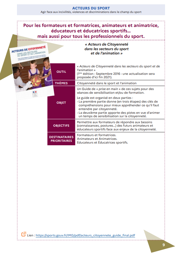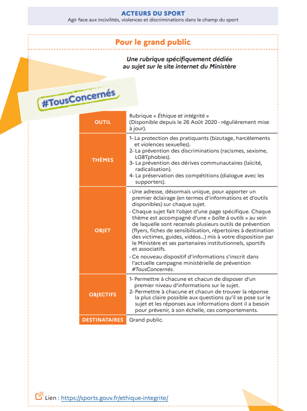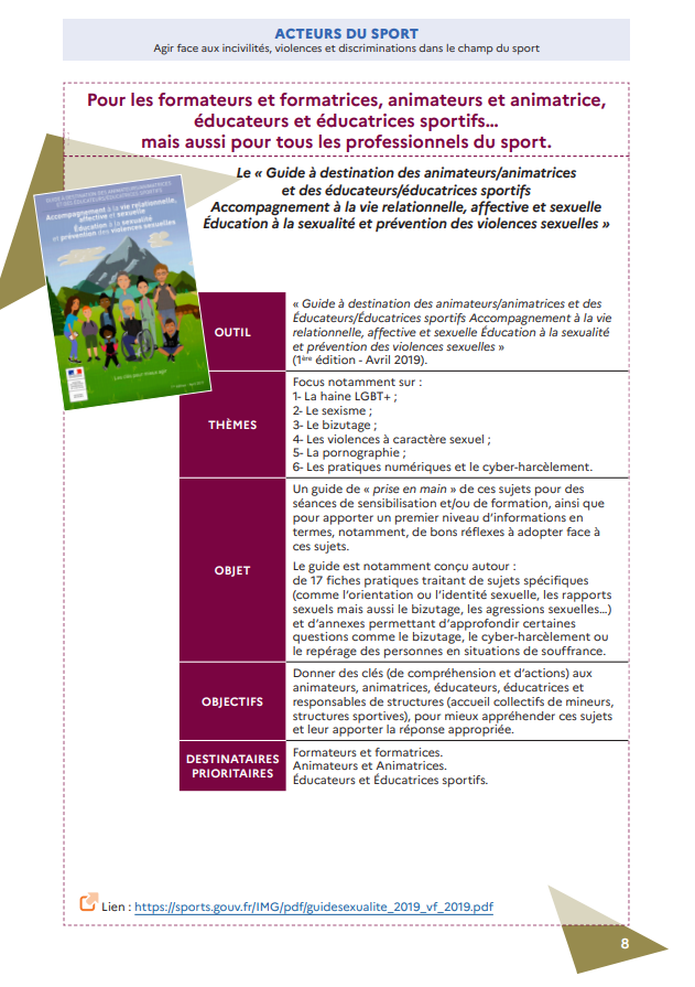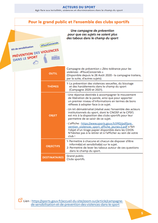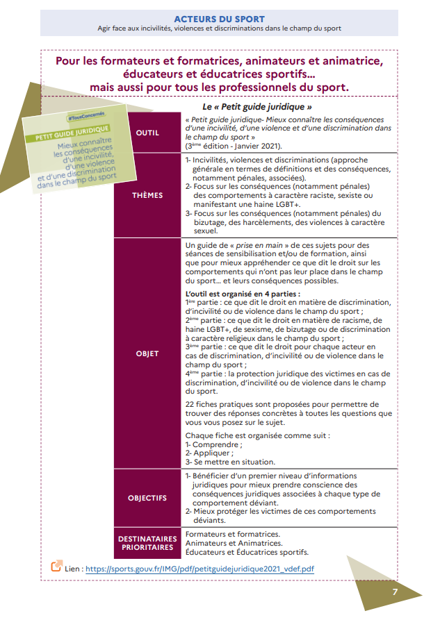 Toujours dans l’optique de lutter contre toutes les formes de violence dans le sport, le Ministère chargé des Sports met à votre disposition 7 outils de prévention pour vous :