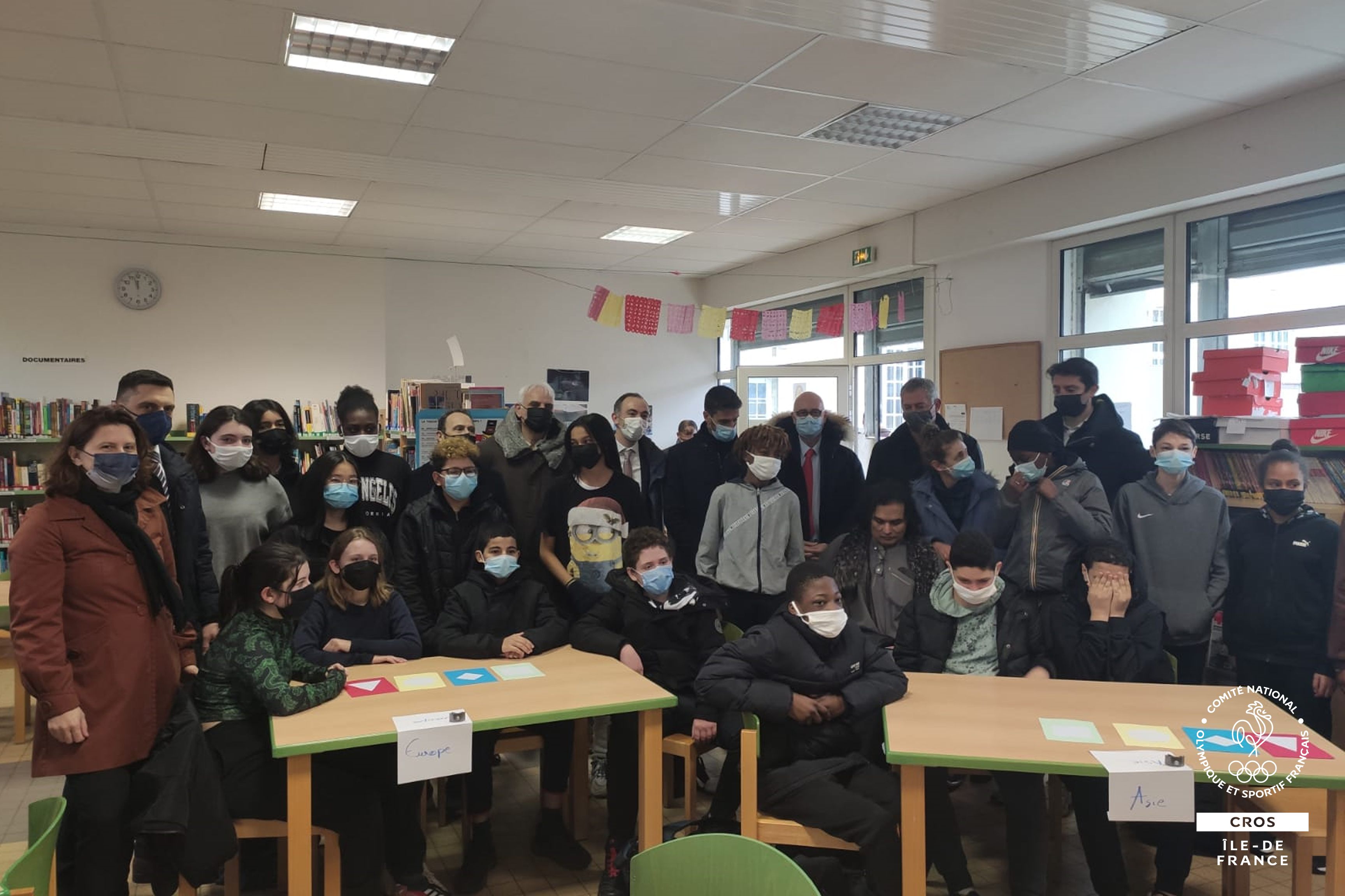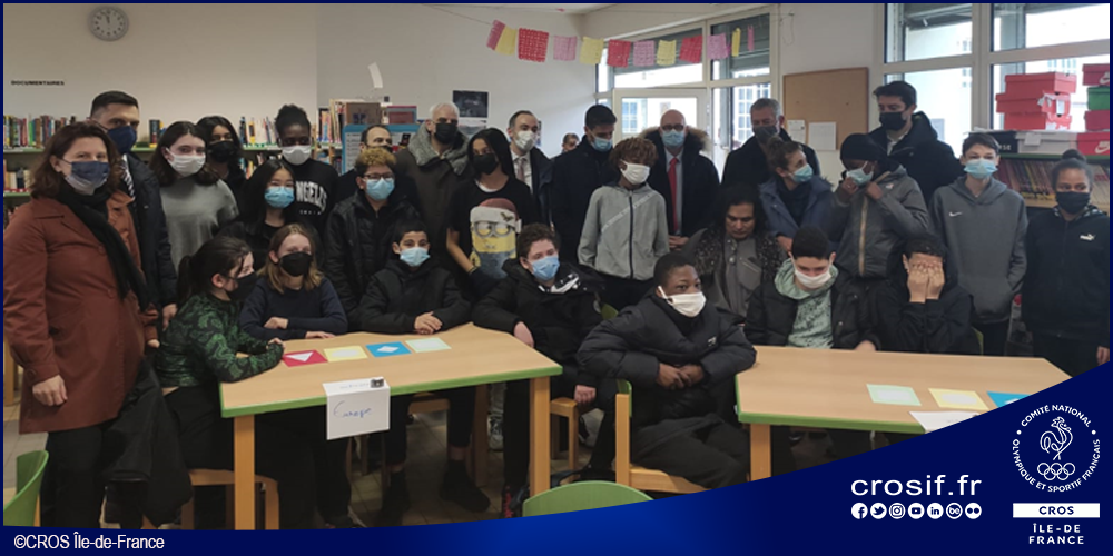 Le mardi 25 janvier au matin, le CROS Île-de-France était au Collège George Sand, dans le 13e arrondissement de Paris, en compagnie de Tony Estanguet, Président du COJOP Paris 2024, de Roxana Maracineanu, Ministre déléguée chargée des Sports et de Pierre Rabadan, Adjoint à la Maire de Paris. De nombreuses activités sportives étaient proposées aux élèves du collège, dont le hockey-sur-gazon grâce à la Ligue Île-de-France de Hockey, ainsi que des témoignages d’athlètes paralympiques dont notamment Arnaud Assoumani et Ryadh Sallem. Un temps d’échange a également été organisé entre les élèves et les représentants du mouvement sportif. Le Ministre de la Jeunesse et des Sports roumain, Carol-Eduard Novak, également athlète paralympique, était également présent au collège, invité par Roxana Maracineaunu dans le cadre de la Présidence Française de l’Union Européenne. De beaux échanges avec les jeunes se sont tenus sur la thématique du sport, en insistant sur l’axe du développement durable, fil rouge de cette semaine.