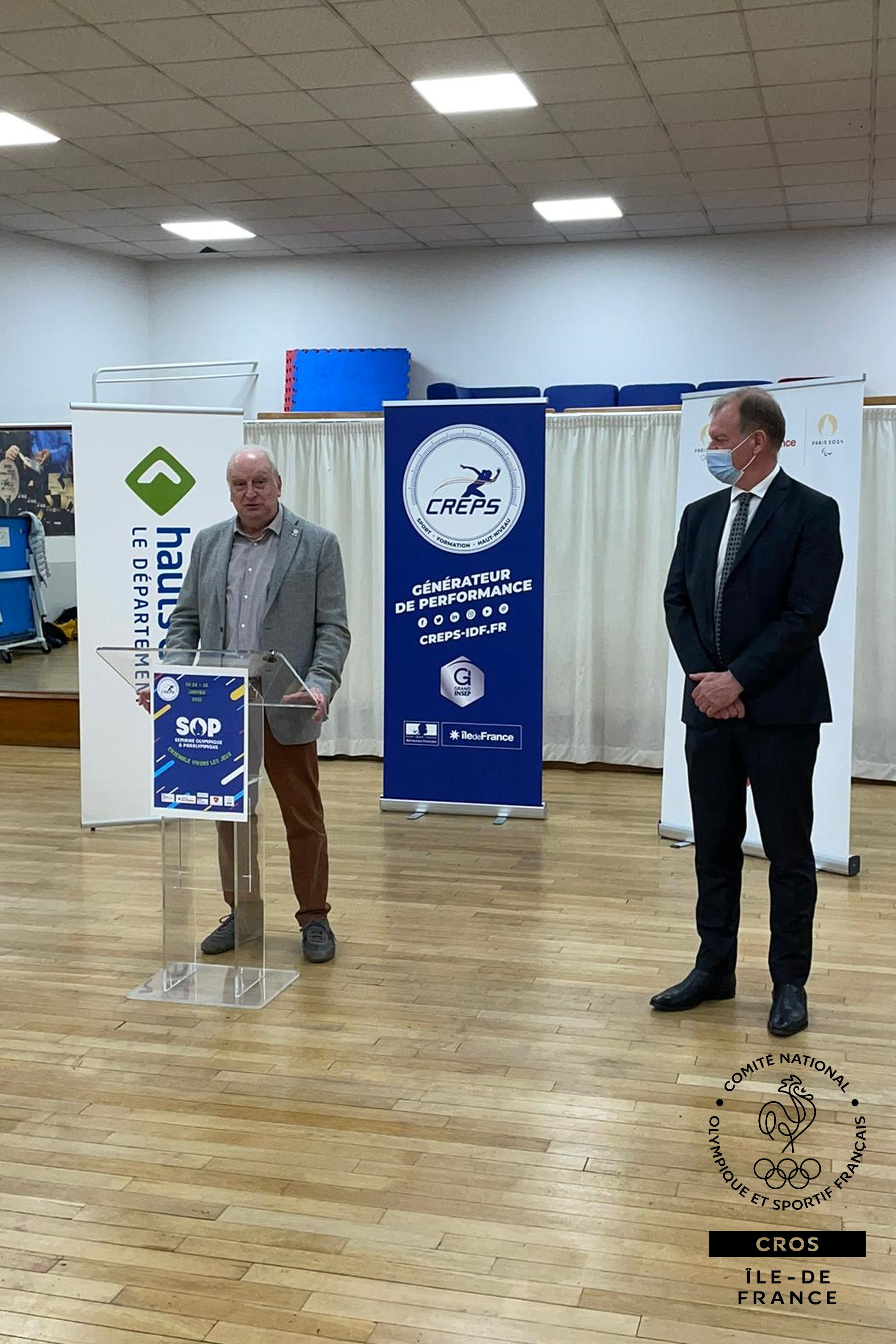 Au CREPS, un temps institutionnel se déroulait dans la matinée avec dans un premier temps une visite des activités sur l’ensemble du site et dans un second une prise de parole des personnalités. Christian Auger, Vice-Président en charge des « Politiques Publiques et Haut Niveau » du CROS Île-de-France assurait la représentation du CROS.