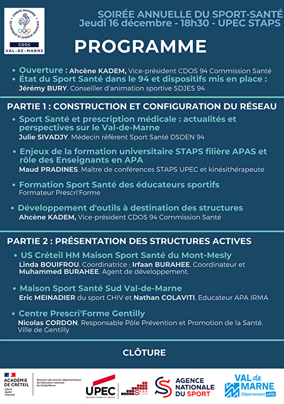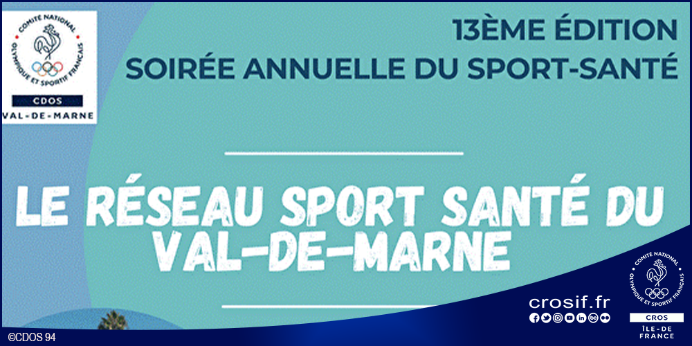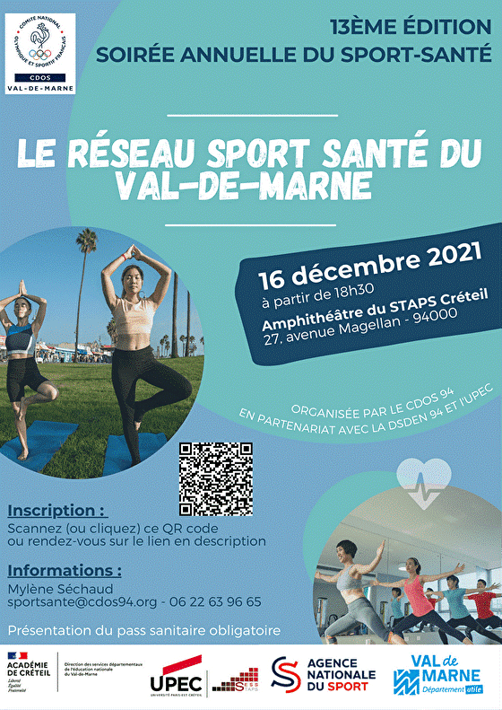 Le CDOS 94 a le plaisir de vous convier à la 13ème édition de la Soirée annuelle du sport-santé, le jeudi 16 décembre 2021, à partir de 18h30. Cette soirée, organisée en partenariat avec la Direction des services départementaux de l’éducation nationale du Val-de-Marne (DSDEN 94) et l’Université Paris-Est Créteil (UPEC), est à destination de l’ensemble des acteurs du sport et de la santé.