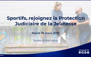 Inscription Rejoignez la Protection Judiciaire de la Jeunesse. Cette soirée vous présentera les missions et les métiers de la Protection Judiciaire de la Jeunesse (PJJ), une administration du ministère de la Justice. La PJJ recrute des sportifs ! Composée majoritairement d’éducateurs, la Protection Judiciaire de la Jeunesse est convaincue de l’intérêt du sport en tant que média éducatif auprès des mineurs délinquants. Les intervenants vous expliqueront les possibilités de recrutement et les carrières [...]