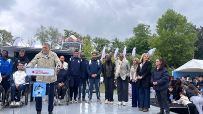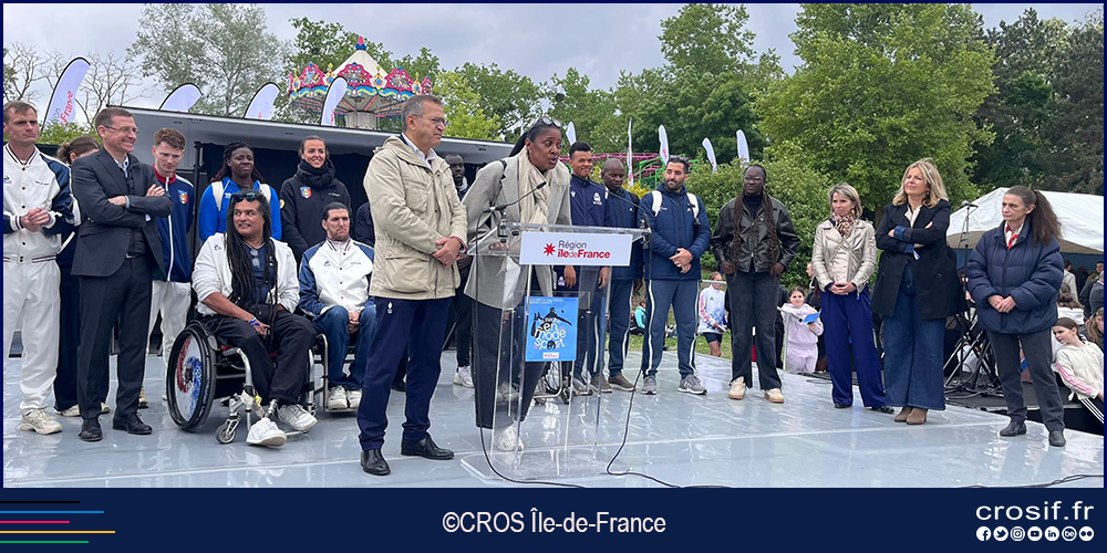 La Présidente du CROS Île-de-France Evelyne Ciriegi accompagnée de membre du bureau était présente aux côtés du Vice-Président au Sport de la Région Île-de-France Patrick Karam, du préfet du Val d’Oise Monsieur Philippe Court, de la Déléguée Régionale Académique Cécile Nicol, du Directeur de la Base de Loisirs de Cergy-Pontoise Fabien Franc et de nombreux athlètes de l’Équipe de France Olympique et Paralympique.