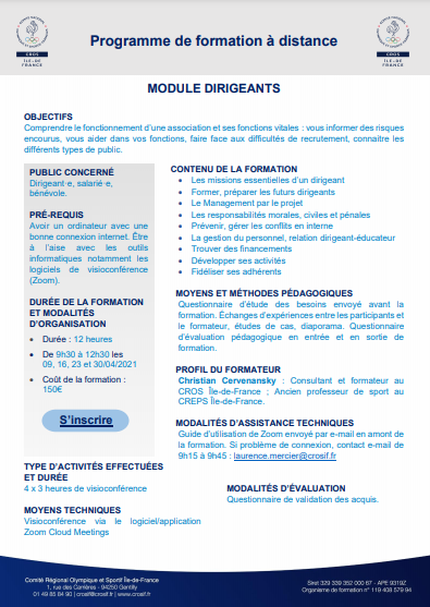 - Module dirigeant 3 : 23/04/2021 (9h30-12h30)